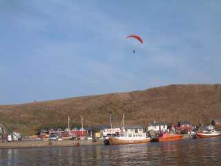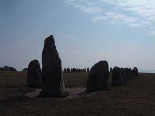 Gislovslaege am Abend 2 Kaseberga ...das Ziel auf der beindruckenden Steilkueste... ...ein Steinkistengrab aus der Zeit unserer seefahrenden Vorfahren Und abends da waren so ´ne Schatten am Himmel...wie fliegende Saurier... ...und bei Licht besehen entpuppten sich die Monster als Gleitschirmflieger! Bornholm Bug voraus...